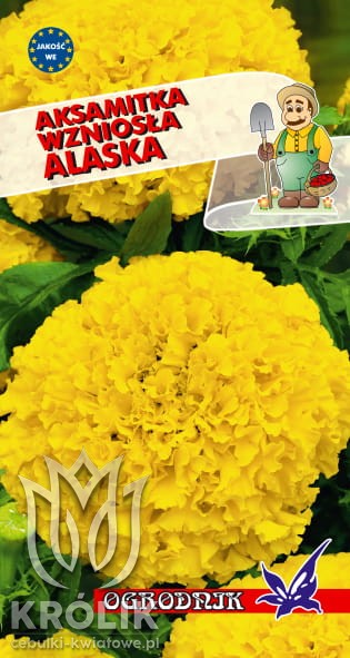 Aksamitka „Alaska” to efektowna, niska odmiana aksamitki o żółtych kwiatach. Roślina osiąga zwykle 20–30 cm wysokości, tworząc zwarte, gęste kępy, które pięknie prezentują się na rabatach, w obwódkach oraz w pojemnikach i skrzynkach balkonowych.