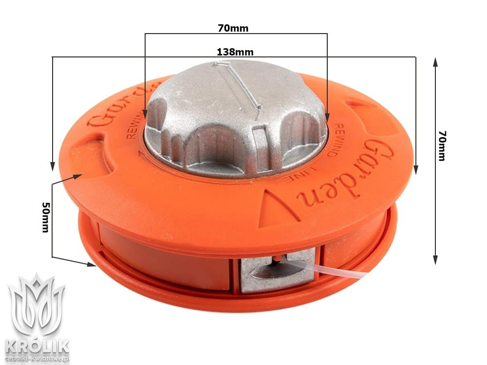 Głowica posiada lewy gwint o rozmiarze M10x1,25 mm, co zapewnia kompatybilność z większością dostępnych kos spalinowych. Montaż jest szybki i prosty, umożliwiając błyskawiczne przystąpienie do pracy.