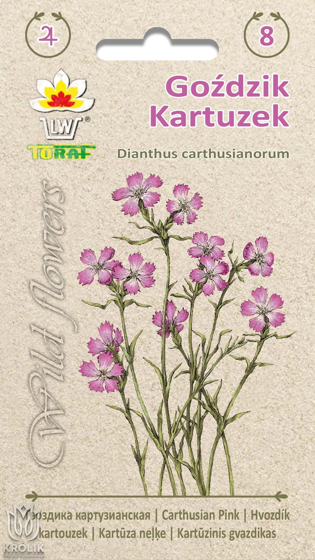 Na sztywnych, pojedynczych, wzniesionych łodygach pojawiają się drobne, ciemnoróżowe kwiaty.